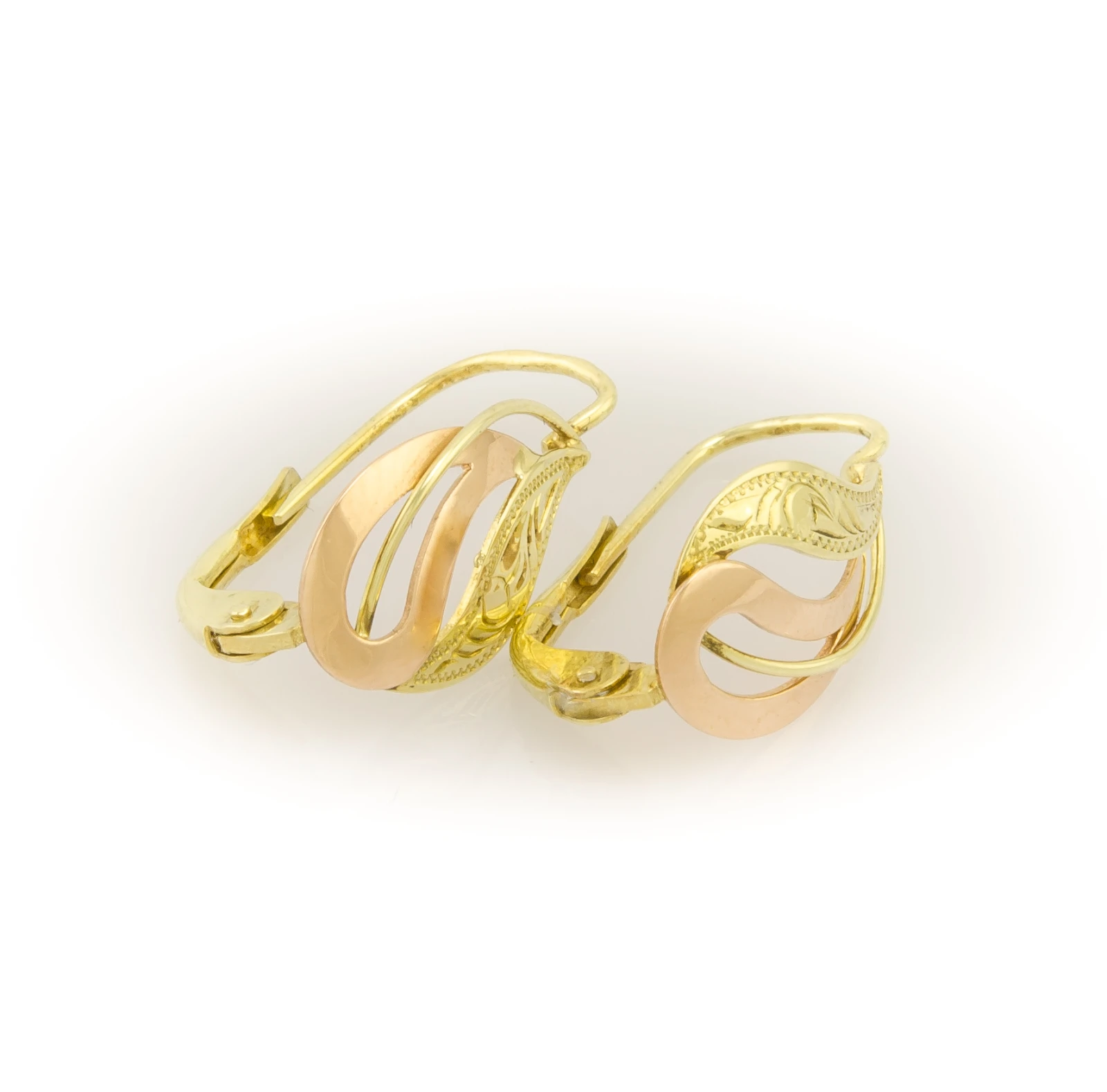 Zlaté dámské náušnice zdobené červeným zlatem a ruční rytinou se zapínáním na patent. Česká výroba, ryzost 585/1000- 14 kar.