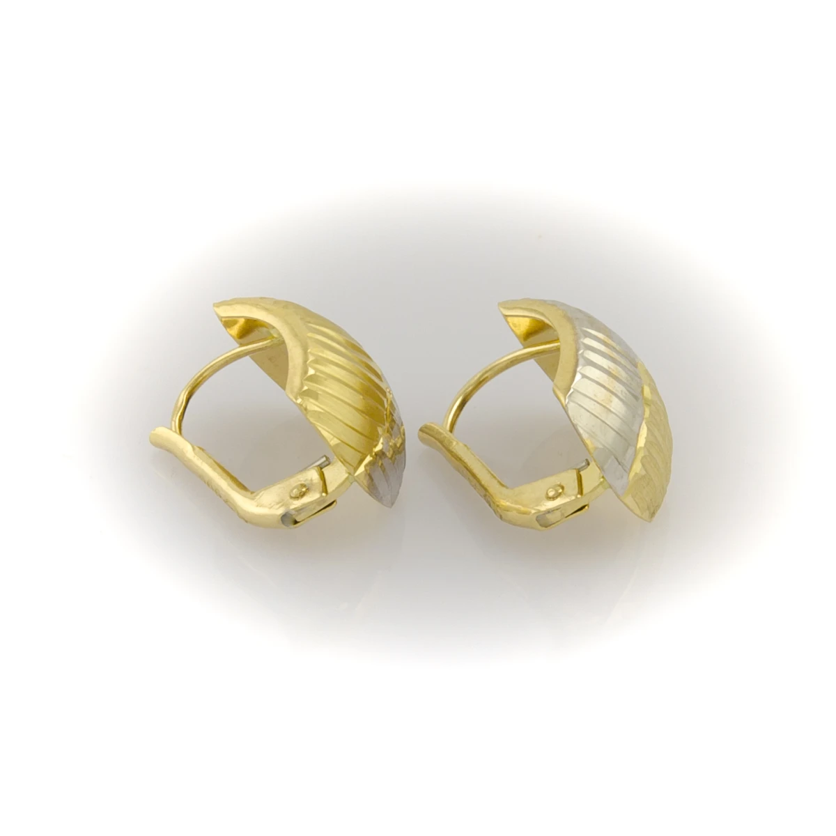 Dámské náušnice ze žlutého zlata zdobené bílým zlatem a rytinou v celé ploše náušnice. Zapínání na patent s možností zhotovení pojistky. Ryzost 585/1000. Krabička jako dárek - zdarma.